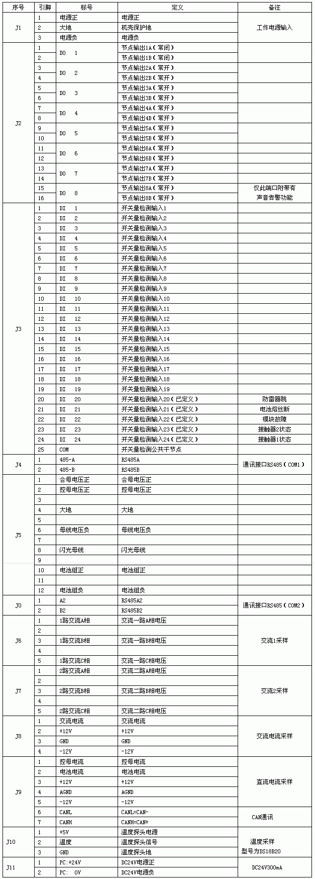 產(chǎn)品展示 PSM-T30觸摸屏監(jiān)控器 在線咨詢 產(chǎn)品詳情 PSM-T30觸摸屏(中央監(jiān)控器): PSM-T30系列智能微機控制器是一套以嵌入式低功耗ARM9主頻400MHZ的CPU為核心的高性能嵌入式一體化工控機。產(chǎn)品的人機界面設計可采用7英寸(10.4英寸、14英寸可選 )高亮度TFT液晶顯示屏(分辨率800×480),四線電阻式觸摸屏。同時還預裝了微軟嵌入式實時多任務操作系統(tǒng)WinCE.NET中文版,和嵌入式組態(tài)軟件。使得監(jiān)控系統(tǒng)運行更加穩(wěn)健可靠。 綜合監(jiān)測單元模塊(此功能單元與觸摸屏配套出廠) 1、概述:綜合監(jiān)測單元模塊是對系統(tǒng)交、直流檢測及對整流模塊進行控制的一種設備,內(nèi)部采用CPU控制,高精度的模數(shù)轉(zhuǎn)換,采用RS485數(shù)字口與上位機通訊,采樣回路與數(shù)字口光耦隔離,因此該模塊采樣速度快,可靠性高。同時給彩屏提供DC24V電源。 2、 實物框圖 3、接線端口定義: 4、此模塊可采集2路三相交流電壓,1路交流電流,3路直流電壓,2路直流電流,1路母線絕緣,1路溫度。 5、可采集24路干節(jié)點輸入,和控制8路干節(jié)點輸出。(注:干節(jié)點輸入:該節(jié)點是反映干接點的閉合狀況的。接入方法為,此節(jié)點只能為接入接觸器(開關)無源輔助節(jié)點)。干接點輸入輸出定義取決于監(jiān)控系統(tǒng)的定義。J2端子輸出定義需要在開關量輸出里根據(jù)故障代碼表具體定義,如有啟動備注里的項目,需要按照定義在對應的開關量輸出里根據(jù)故障代碼表定義。 6、具有2路RS485通訊,1路CAN通訊。單元內(nèi)置CAN通訊模組可以對具有CAN通訊的整流模塊進行通訊,控制。 7、絕緣監(jiān)察繼電器功能,閃光繼電器功能。 8、霍爾電流采樣:該插座分別接入兩只霍爾?;魻柕陌惭b方法:電池電流采樣的串入電池回路中,電池充電時,霍爾輸出為正電壓信號??啬鸽娏鞑蓸拥目啬富芈分?,控母有負載時,霍爾輸出為正電壓信號。 霍爾安裝位置、方向示意圖